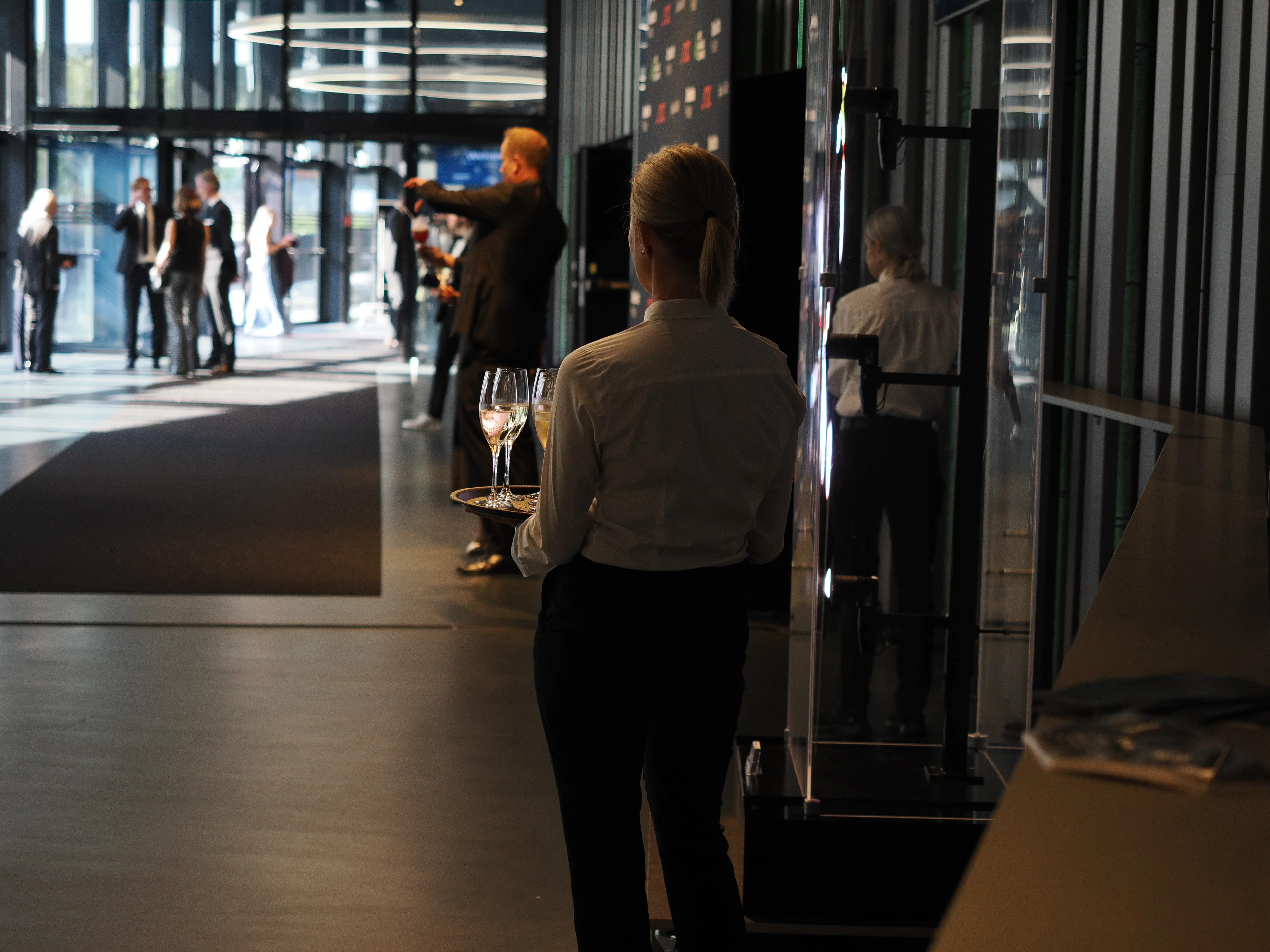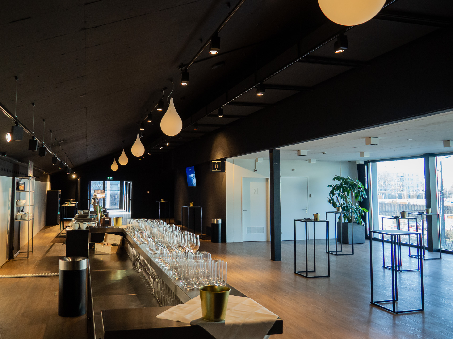 Die Foyers eignen sich ideal für Stehtisch-Situationen bei Apéros, Empfangsbereiche oder Pausenflächen.