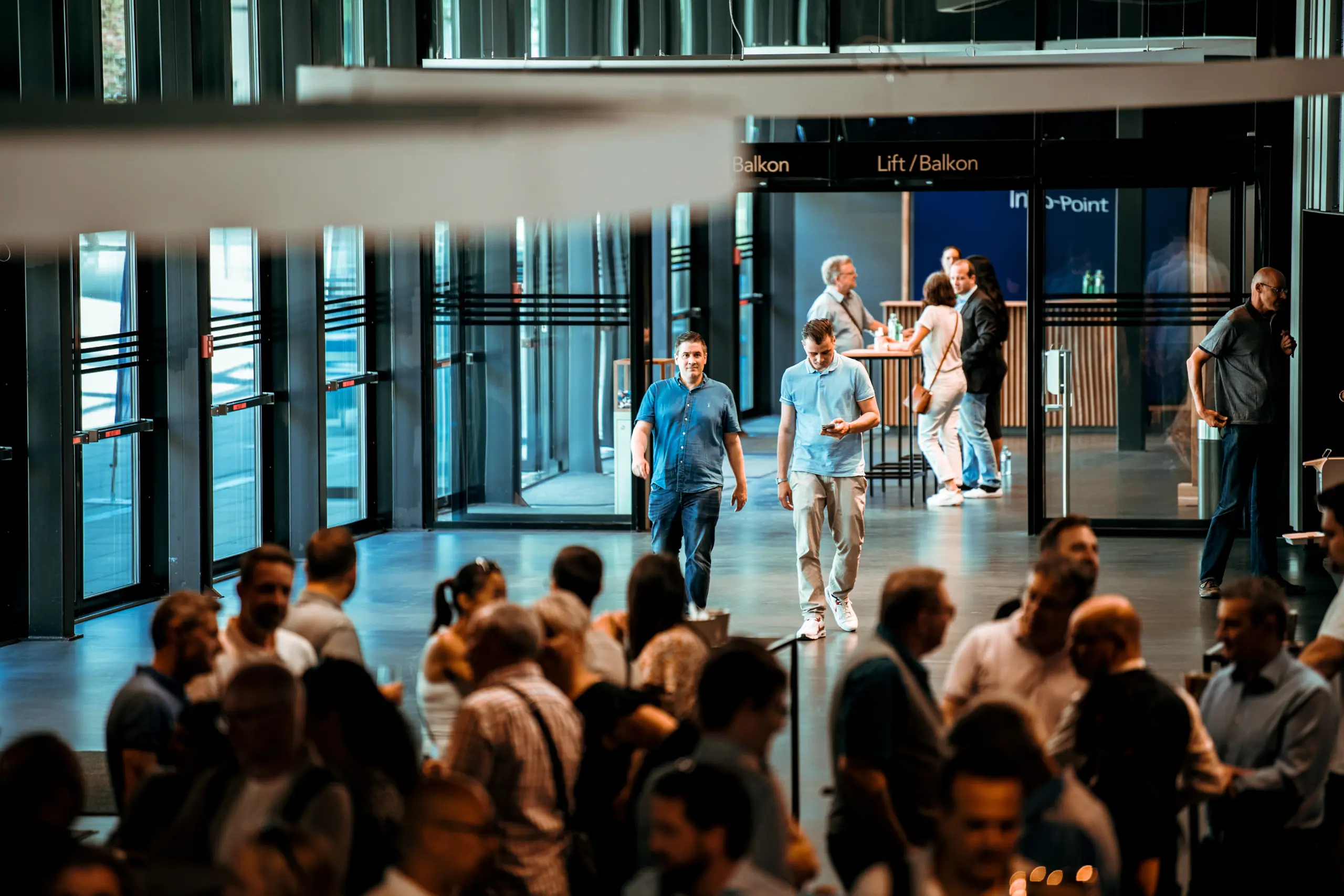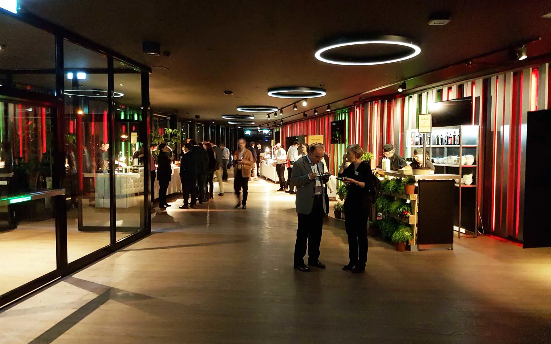 Die verschiedenen Foyers bieten flexible Zusatzflächen für Ihren Event. Ob Empfang, Pausenverpflegung, Apéro oder Break-out-Sessions – hier entstehen Begegnungen ausserhalb des Hauptprogramms. Ambientlichter lassen sich individuell in jeder Farbe ausleuchten und an Ihr Corporate Design anpassen. Auf den integrierten Screens präsentieren Sie die Inhalte Ihrer Wahl – von Begrüssungen bis zu Branding oder Programmhinweisen.