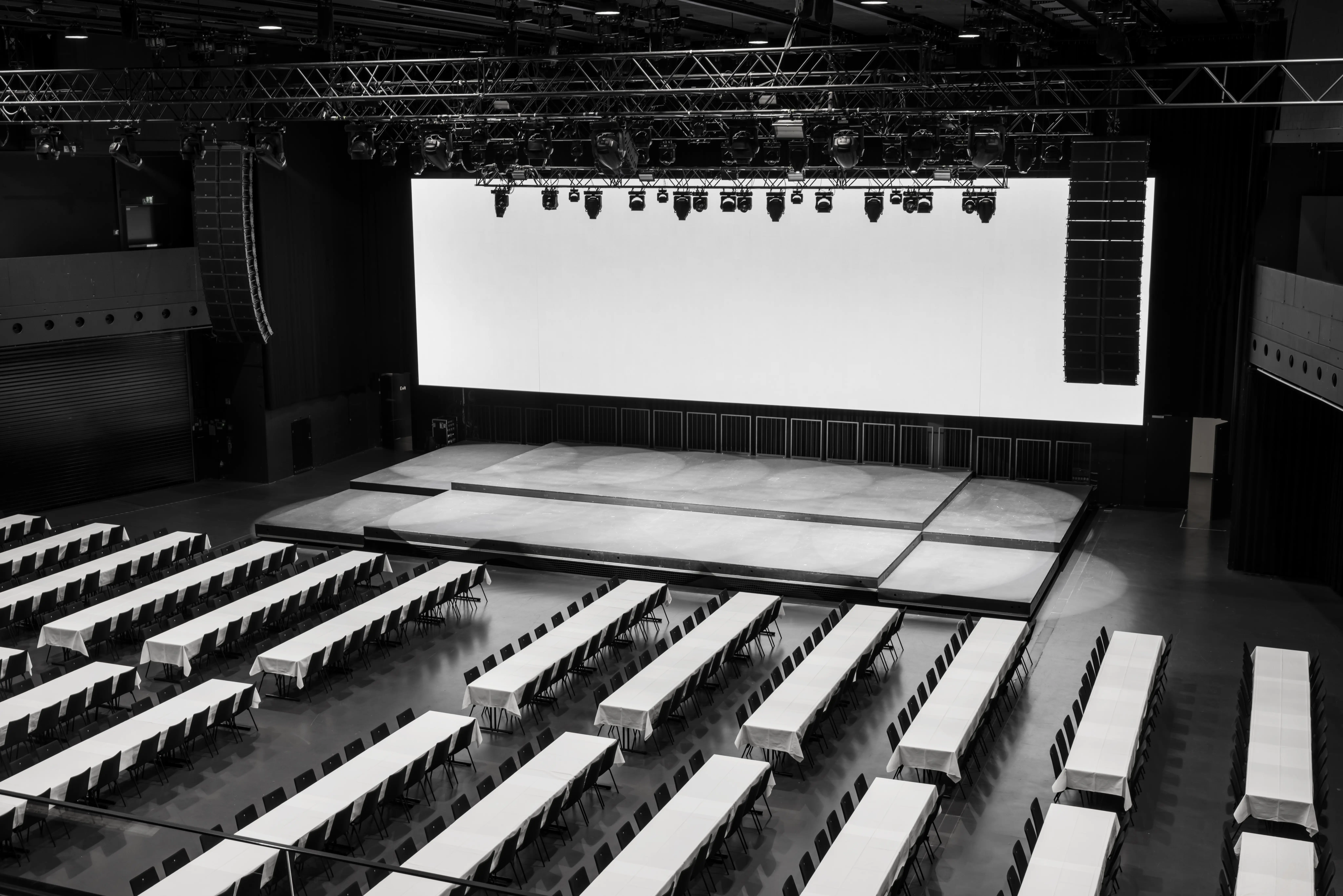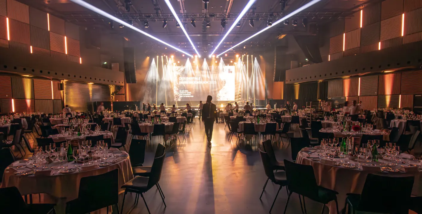 Gala-, Bankett-, Seminar- oder Theaterbestuhlung: Die HALL ermöglicht vielfältige Set-ups für unterschiedlichste Veranstaltungsformate. Die säulenlose Fläche bietet maximale Flexibilität für individuelle Raumkonzepte, Ausstellungen oder massgeschneiderte Aufbauten. Tische, Stühle und Tribüne stellen wir direkt vor Ort bereit.