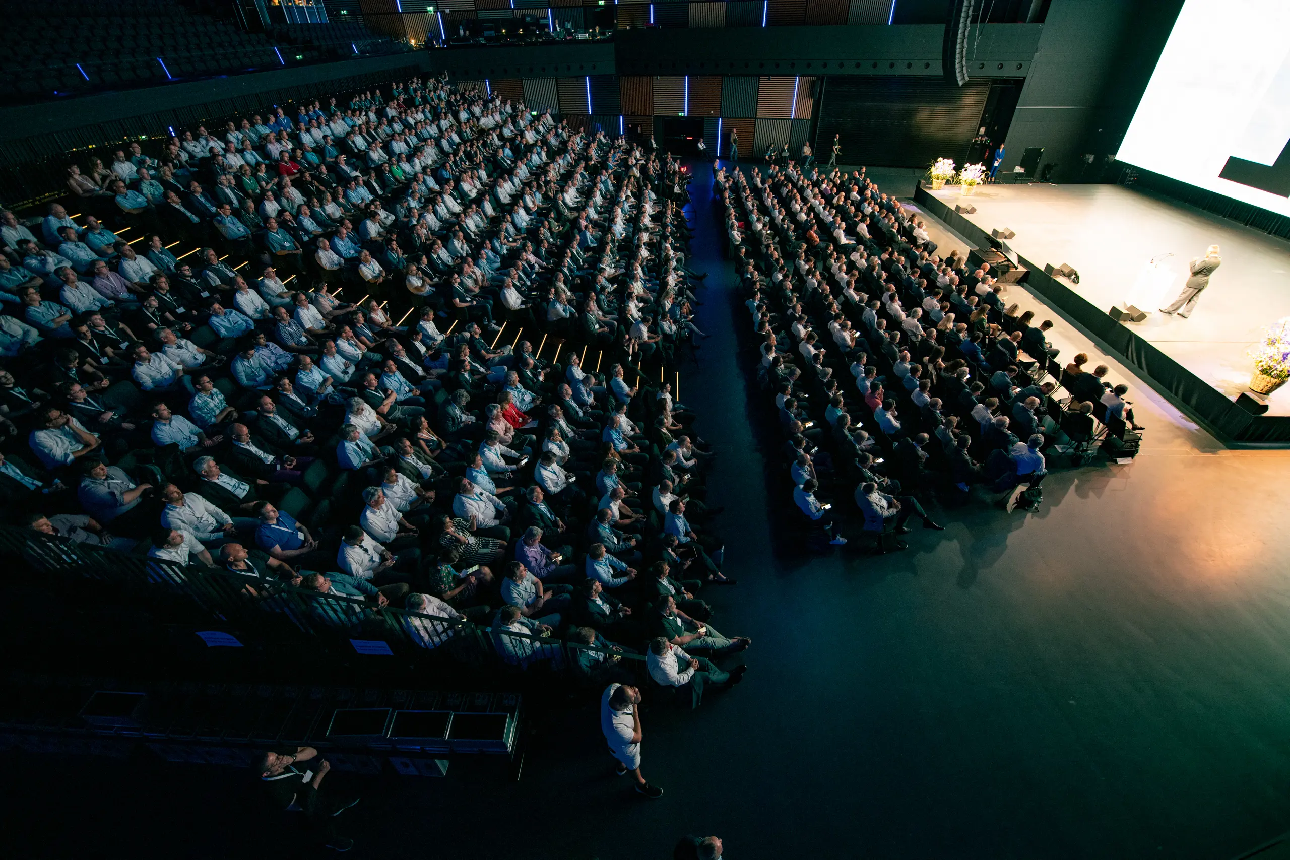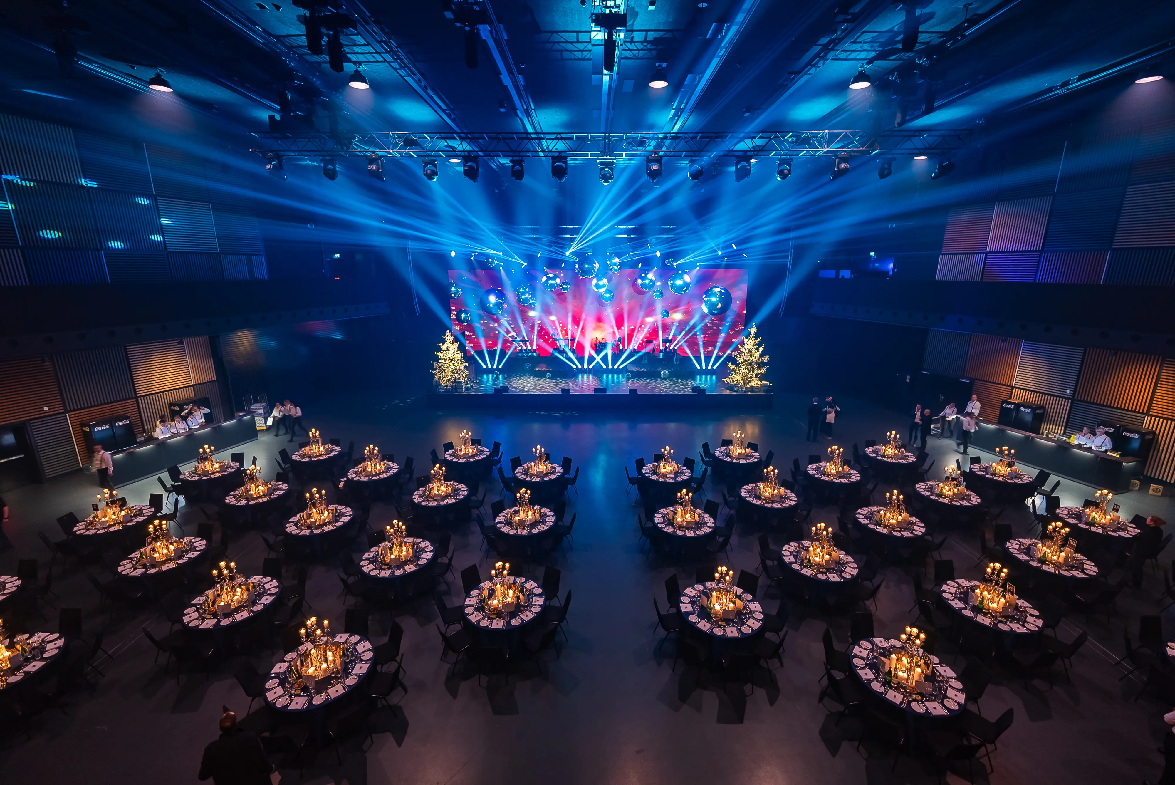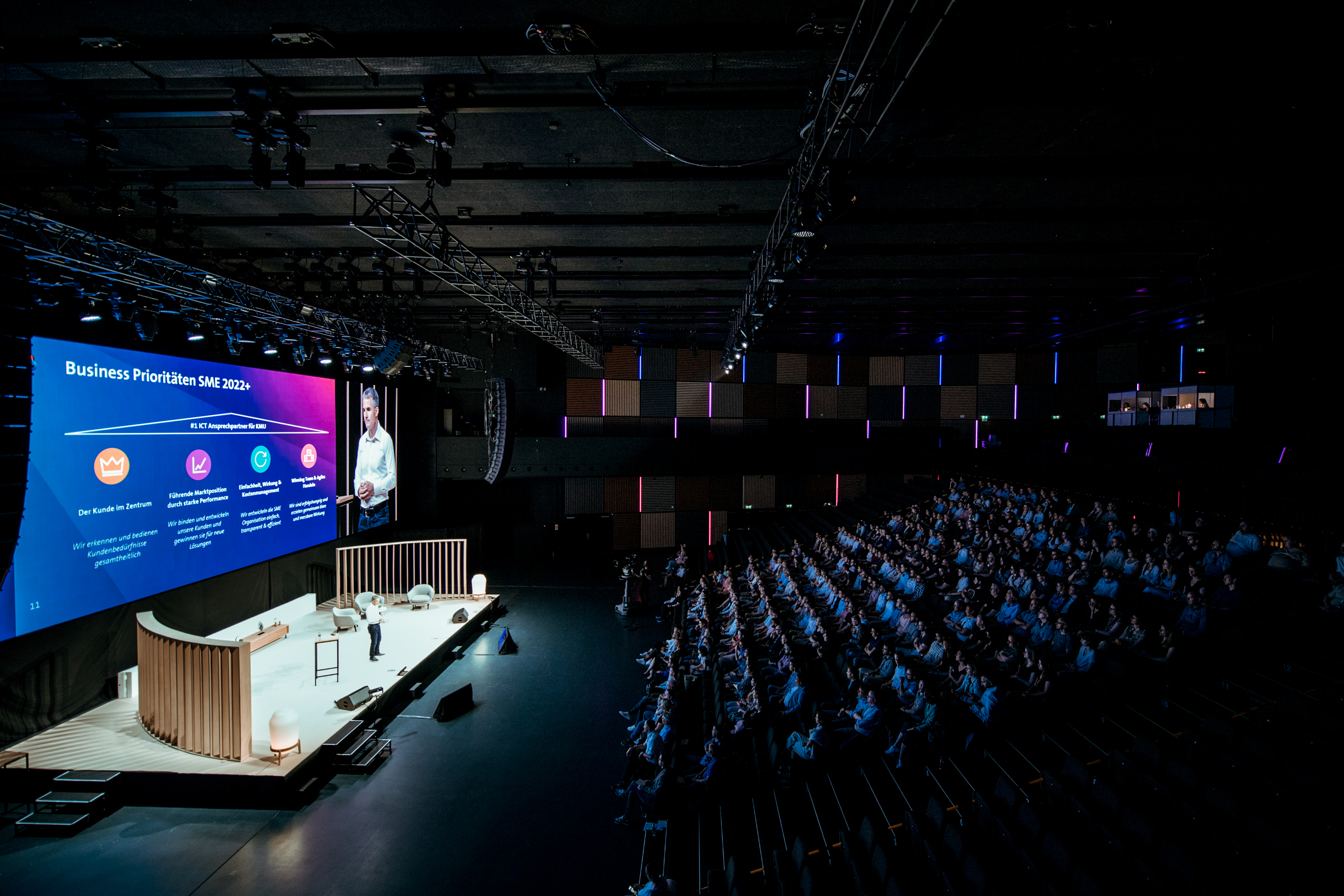 Der dreifach teilbare LED-Screen mit 120 m² Fläche (4 mm Pixelpitch, 5K-Auflösung) bietet beeindruckende Bildqualität und flexible Inszenierungsmöglichkeiten für unterschiedlichste Eventformate.